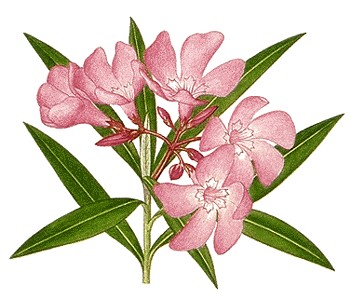 夹竹桃又名:拘那夷、拘拏儿、棋那卫、柳叶桃、枸那、桃叶桃、叫出冬、枸那异、水甘草、九节肿、大节肿、白羊桃、红花夹竹桃、状元竹、柳竹桃、柳条花、三季红、三李白、洋桃、柳叶树、洋桃梅、四季红、红羊皮。气特异,味苦;有毒。常绿直立大灌木,高达5m。全株含水液,无毛,枝条灰绿色。花期几乎全年,果期一般在冬、春季,栽培很少结果。全国各地均有夹竹桃栽培,尤以南方为多。