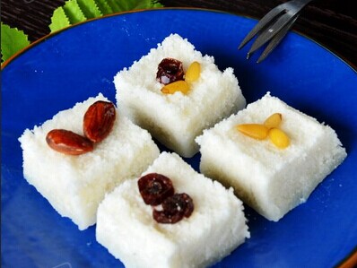 在韩国家庭中,年糕和米糕做的食品是具有很高的家庭餐饮地位的。韩国的年糕健康食谱通常使用糯米制作,用类似我国的花色糕点模具,木模分陶制和木制两种,韩国的米粉蒸糕木模非常迷你,制成的米粉蒸糕点心一般跟一个带壳的核桃差不多大小,扣出各种形状、五花八门口味的小糕点。在韩国的节日,送礼是不能缺少米粉蒸糕的,尤其送娘家礼中更不可或缺,据说米粉蒸糕有着表达诚心、爱心和孝心的寓意。搬家的时候,还有做米糕分给邻居的习俗。在韩国的出土壁画里,韩国的新罗时代(公元676年至935年)就有了打糕的场面,在朝鲜时代(公元1392年至1910年)韩国的米粉蒸糕文化达到鼎盛时期。这款白雪米粉蒸糕的做法是把白色的米粉放入蒸笼后蒸出来的糕点,制作程序简单很受人们喜爱。刚出笼的蒸糕毛茸茸的,味道非常好吃,是在孩子百日或者一周岁时可制作的糕点,因为这款米粉蒸糕就像孩子的眼睛一样纯洁明亮白雪无瑕。韩式白雪米粉蒸糕的做法步骤1.准备好所有的食材。2.粳米粉中加入2勺清水。3.然后用手轻搓米粉让其和水充分的搅拌均匀。4.为确认米粉中含水程度,可用手攥紧一把米粉成团,然后张开手轻轻晃动,米粉不会散开就说明水量正好。5.然后把米粉用面箩过筛,要用手反复压制米粉。6.筛过的米粉加入白糖搅拌均匀。7.蒸锅中放入蒸笼布放入模具,可在模具底部撒上一勺白糖。8.然后均匀的倒入米粉用刮板刮平表面。9.用尺子把米粉划成小块状,上面装饰坚果和大枣花。10.加盖大火蒸制25分钟,可在盖子下面垫上一块蒸笼布。11.蒸好的蒸糕要焖5分钟,然后开盖稍微冷凉。12.然后取出米粉蒸糕切块即可食用。韩式白雪米粉蒸糕的做法小贴士1、这里所用的米粉是我自己打磨的米粉,要把粳米用清水浸泡8小时,然后沥干水分在打磨成米粉。2、如果你是买的现成的米粉,那么水量要加倍,水量的多少可以用我上面的方法来调整。3、这里的米粉和水量所用的量杯和量勺为200毫升的量杯和15毫升的量勺。4、在蒸笼布上面撒上一些白糖,可以更加方便取出蒸糕而不粘蒸笼布。5、蒸制米粉蒸糕的时候,可在盖子底下垫上一块蒸笼布,这样可以防止水蒸气流入米粉糕表面,成品更加美观。
