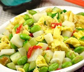 菜场里很容易买到的山药因具健脾补肾功效,是人们都喜爱的药膳。山药的味道甜润,性平和,归肺、脾、肾三经。主要食用疗效作用为补脾止泻,养肺宁嗽,固肾益精,养阴止渴。山药的主治范围为健脾开胃补虚泄泻,食少浮肿;肺虚咳喘,消渴;肾虚尿频,遗精,带下;外可治疗痈肿、瘰疬等。山药不但可成为日常健脾补肾的良药,同时又是家常的药膳材料,价格又十分亲民。下面就介绍几款健脾补肾方。山药炒蛋:鲜山药250克,鸡蛋2只。山药去皮洗净,切片;鸡蛋磕破,打匀。锅内加食用油后倒入鸡蛋蛋液加热至七成热时,再放人生姜丝,煸至香气大出,下山药片,炒至软,将山药拨向一边,将鸡蛋倒入锅内另一边,待蛋液结成块,再将鸡蛋同山药一并煸炒均匀,放入盐后炒拌几下,放点味精调鲜亦可,即可上盘食用。山药炒蛋味美可口,健脾开胃,可增加食欲。山药黄瓜粥:怀山药60克,黄瓜150克,糯米50克。先将怀山药加工成细粉;黄瓜洗净,榨汁;糯米加水煮粥,粥将成时,加入山药粉、黄瓜汁,搅拌煮沸后即可食用。山药黄瓜粥具有滋润皮肤的作用,适宜于美容健身。珠玉二宝粥:生山药、生薏苡仁各60克,柿霜饼24克。上三味,先将山药、薏苡仁捣成粗渣,煮至烂熟,再将柿霜饼切碎,调入溶化,随意食之。此珠玉二宝粥可健脾开胃养肺,主治肺脾阴虚,饮食懒进,虚劳咳嗽,并治一切阴虚之证。六元解毒汤:怀山药30克,人参5克,莲子、薏苡仁各 20克,芡实、茯苓各15克。将以上药物放入锅内,加水500毫升,煎取 200毫升,滤出;再加水500毫升,煎取200毫升。将两次药液混合后分两次服用。本方功能健脾益气补虚劳,可用于慢性胃炎、胃下垂及久病身体虚弱、不思饮食者。山药汤:山药、黄芪、熟地各15克,远志12克,石菖蒲10克。水煎服,每日煎服两次。亦可按此方比例酌情扩大用量,将诸药烘干,研为细粉,炼蜜为丸,每次8克,早晚空腹各服1次,温开水送下。本方能补气养阴、宁神益智,可用于神经衰弱、精神不振、失眠健忘、气短乏力等。山药的药理研究现代研究表明,山药含有人体不可缺少的氨基酸、蛋白质、多糖、钙、磷、铁、维生素等多种营养物质。临床实验证明,山药能增进食欲,改善消化,降低血糖,调节自主神经,增强体质。山药含有大量的黏蛋白,黏蛋白是一种多糖蛋白质的混合物,具有特殊的保健作用。它能防止脂肪沉积在心血管上,保持血管的弹性,阻止动脉粥样硬化过早发生;能减少皮下脂肪的堆积;能防止结缔组织萎缩,预防类风湿关节炎、硬皮病等胶原病的发生。