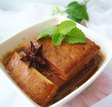 卤汁豆腐干是一道可以当小吃的凉菜,豆腐干属大豆制品,豆腐干营养丰富,含有大量蛋白质、脂肪、碳水化合物,还富含有钙、磷、铁等多种人体所必需的矿物质养分。卤汁豆腐干的做法用的高汤咸淡刚好,所以没有再加酱油调味。卤汁豆腐干的做法在煮的过程中要注意必须一直用小火,不要转大火收汁,这样浸泡的豆腐干吃口会更好。先把豆腐干油煎一下,吃口有嚼劲很鲜香。夏天制作卤汁豆腐干,可连同卤汁一起进冰箱冷藏之后再食用。卤汁豆腐干的做法材料主料:豆腐干 300g 辅料:油适量,高汤适量,冰糖适量,八角适量,生姜片适量卤汁豆腐干的做法步骤1.准备调料(冰糖,八角,生姜片)2.先把豆干横竖切花刀3.切好的样子,这样便于更入味4.锅内油温5分热先加入生姜片和少量八角爆香5.之后把豆干煎至表面起皱捞起6.高汤7.重新洗锅后倒入高汤加入豆腐干8.再加点啤酒增加鲜香味9.下入八角10.加入白糖11.盖上大火烧开转小火煮至豆干松软入味即可12.豆腐干连同卤汁一起盛入碗中卤汁豆腐干的做法技巧1、油豆泡是在市场上买的,当然也可以自己炸。2、由于放入了老抽,所以最好不要放盐了,否则味道会很咸。3、加入了干辣椒之后再加入一点白糖,会让口感更佳丰富。