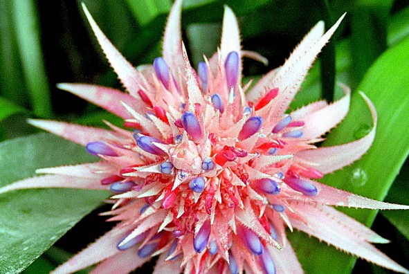 花卉粉菠萝的功效与作用花卉粉菠萝又称五彩菠萝,为一种观赏用植物。由于粉菠萝花造型可爱,又有“旺来”之意,在节前成为人们喜购的吉利植物。粉菠萝是一种很特别的植物,只要利用好它的美,相信粉菠萝能给你的家居带来不一样的变化。粉菠萝的介绍1、粉菠萝属多年生、附生的常绿草本植物。叶基生,粉菠萝那莲座状叶丛基部围成筒状,可以贮水。叶条形至剑形,长可达45-70厘米以上,革质,被灰色鳞片,绿色,叶面上常见虎纹状银白色横纹,边缘有黑色小刺。花葶直立,花序穗状,密集成阔圆锥状的球形花头。苞片革质,先端尖,淡玫瑰红色。小花无柄,淡蓝色。常见的园艺粉菠萝品种有:银边美叶光萼荷,粉菠萝叶背固有银白色条纹,紫缟光萼荷,叶丛间多带点紫红色斑,斑叶光萼荷等。2、粉菠萝的园林用途。美叶光萼荷莲座状叶片有虎纹状银白色横纹,夏季一般会开淡蓝色小花。如想提前开花,可用1-2只熟苹果放在株旁,用塑料袋连植株一起罩住,苹果释放的气体可以促进开花。常作盆栽或吊盆观赏,用它美化居室,布置厅堂十分理想。3、粉菠萝能起到光合作用,对环境净化很有帮助。粉菠萝的具纤维质须根系;肉质茎为螺旋着生的叶片所包裹,叶剑形;花序顶生,着生许多小花;肉质复果由许多子房聚合在花轴上而成。喜温暖,以年均温24~27℃生长最适。15℃以下生长缓慢,5℃是受冻的临界温度,43℃高温即停止生长。耐旱,但仍需一定水分,以1000~1500mm的年雨量且分布均匀为宜。较耐阴,但充足的阳光生长良好、糖含量高、品质佳。对土壤适应性广,喜疏松、排水良好、富含有机质,pH值5~5.5的砂质壤土或山地红壤较好。菠萝株高0.7~1.5米,茎短粗,呈褐色,基部有吸芽抽出。根着生茎的周围。叶自茎的上部丛生。穗状花序自叶丛中抽生。果实肉质,似松果状复果,多呈圆筒形,果肉黄色。粉菠萝的养护方法1、粉菠萝的播种繁殖:美叶光萼荷开花后经人工辅助授粉易得到种子。种子小,需用小粒种子播种法进行播种。在温度为25~30℃的条件下,播后一个月左右可以出苗。约3~4年后长成开花植株。2、粉菠萝的分叶繁殖:美叶花萼荷一生只开一次花。花后会在老株的基部生长出一至数枚蘖芽。待芽长至10厘米左右时,切离母株,剥去芽下部叶片,稍晾后栽植,保持盆土湿润,待生根后转入正常管理。3、粉菠萝的病虫害防治。空气干、温度高时,会产生介壳虫。也会发生枯萎病,得病的植株,最好立即毁掉,以防传染。粉菠萝的生长习性粉菠萝原产南美巴西东南部。粉菠萝喜阳光充足,亦耐阴;适宜温暖潮湿的环境,又颇耐旱;要求富含腐殖质、疏松肥沃、排水透气良好的土壤。粉菠萝的栽培繁育蜻蜓凤梨是凤梨科多年生附生性草本。叶莲座状,宽、弯曲,灰绿有银白色条纹,叶缘有刺。圆锥花序,塔形,上有粉红色苞片,小花蓝色。可连续开几个月。原产中美和南美热带和亚热带地区。既喜阳光,又畏惧强烈的直射光。在室内应放东窗口,夏天置于北窗,冬天置于南窗。生长适温16~18℃,50%~60%的湿度,高温时给植株喷水。用微温的软水,pH4。1~4。5。用雨水最好。开花后老株可能再活6~8个月,老株的基部会长出小植株,等小植株长到母株一半大时可掰下来栽植。移植前2周,在小植株的漏斗中灌些水,移植时尽可能保留一些老株的根。叶花均美,适置于几架、案头上盆栽观赏。可采用播种和分蘖繁殖。 1、播种繁殖:美叶光萼荷开花后经人工辅助授粉易得到种子。种子小,需用小粒种子播种法进行播种。在温度为25~30℃的条件下,播后一个月左右可以出苗。约3~4年后长成开花植株。 2、分蘖繁殖:美叶花萼荷一生只开一次花。花后会在老株的基部生长出一至数枚蘖芽。待芽长至10厘米左右时,切离母株,剥去芽下部叶片,稍晾后栽植,保持盆土湿润,待生根后转入正常管理。